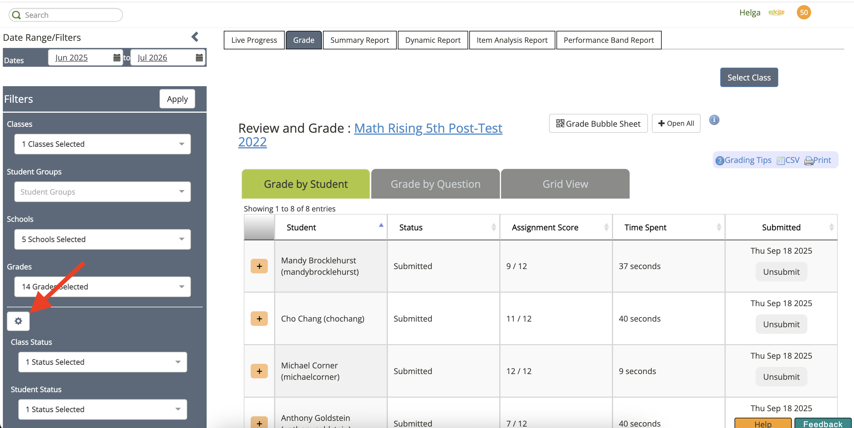 Note: admins also have the option of accessing data for archived students and classes within a specific report by clicking the Settings Gear on the left side of the page at the bottom of the filtering tools. When archived data is included for classes and students, be sure to adjust the dates at the top to include the student submissions to be analyzed.