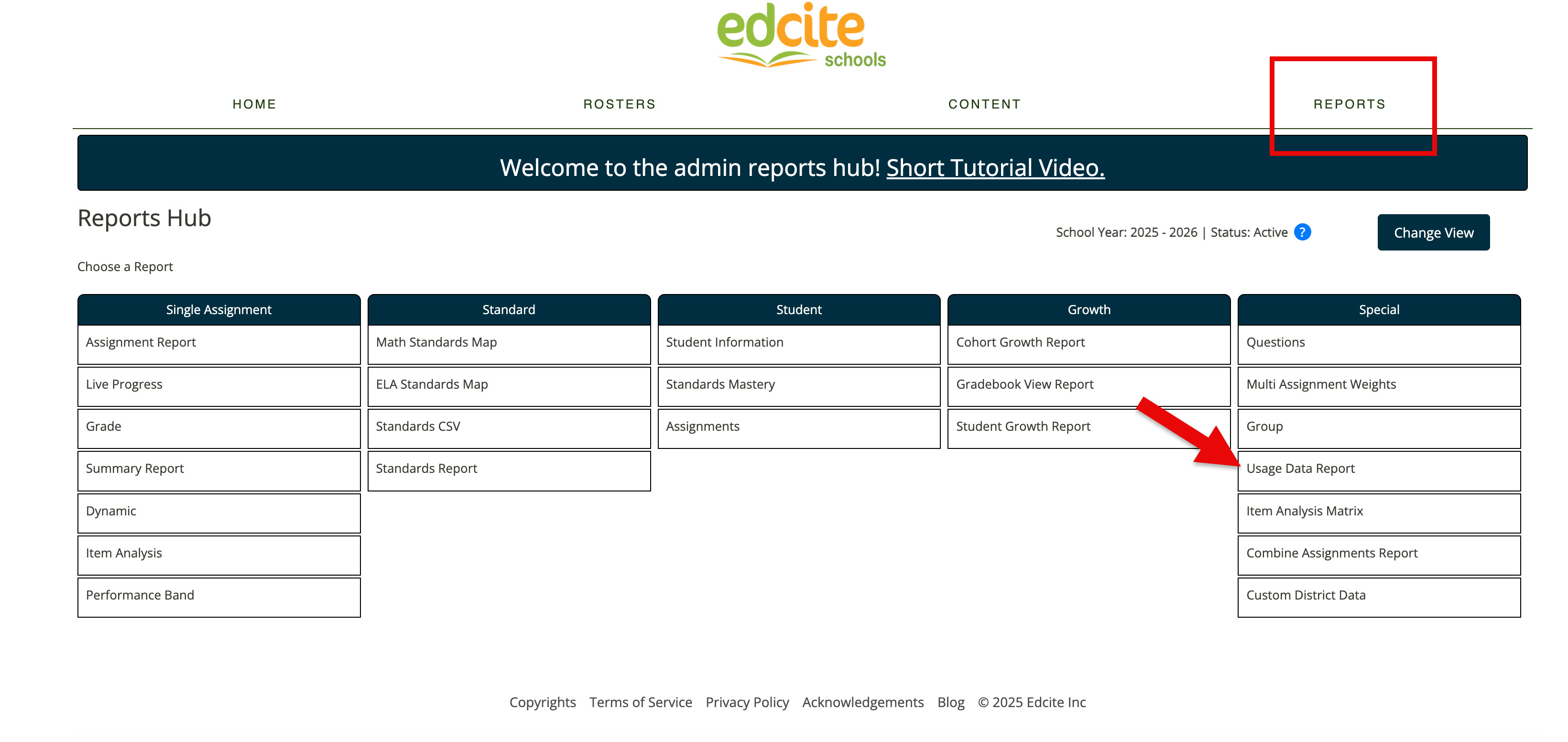 1. To access the Usage Data Report from your admin account, click on Reports and then Usage Data Report.