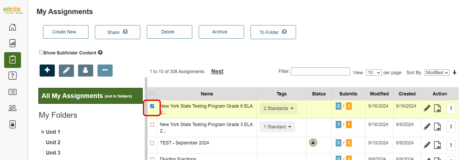2. Choose the assignment(s) you would like to Archive by selecting the box(es) to the left of the assignment name(s).