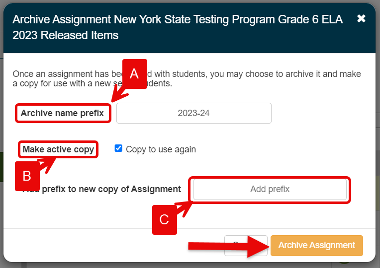 - Create an "Archive name prefix." We suggest using the school year the assessment was used.