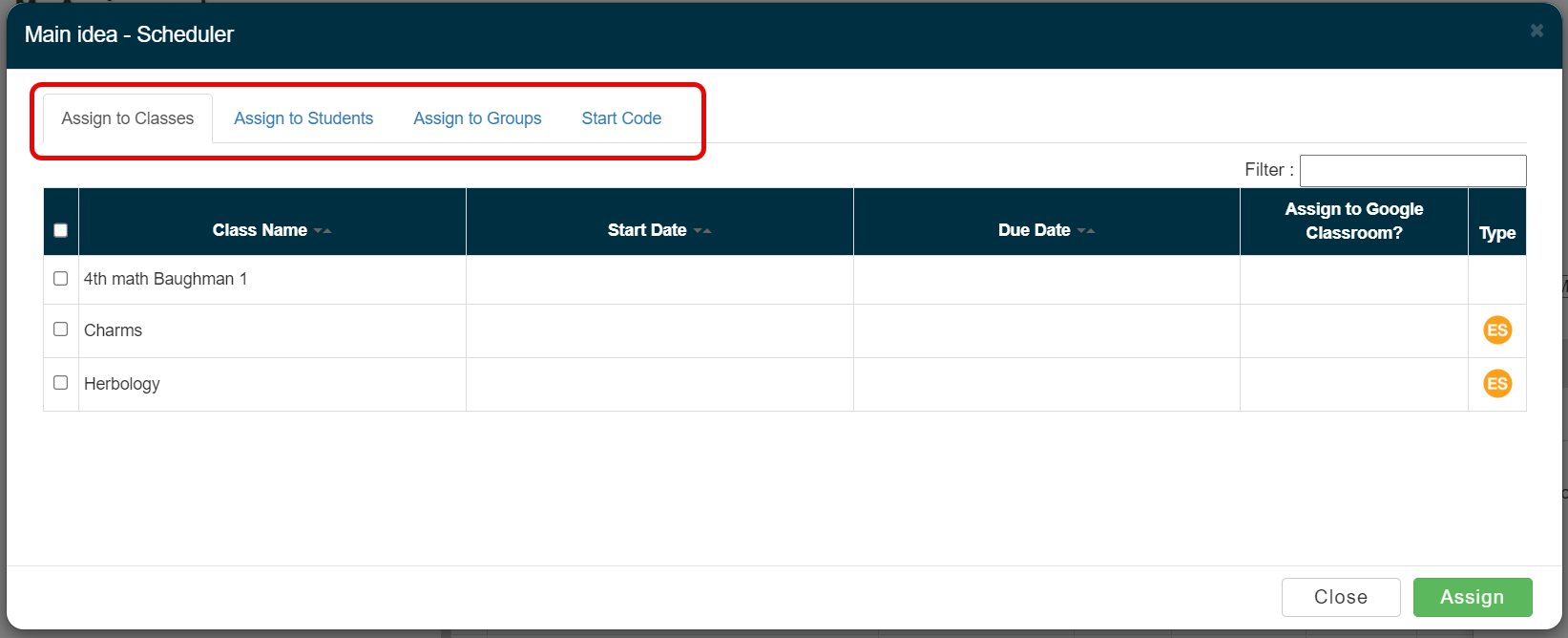4. The Assignment Scheduler will pop up, and you can Assign by Class, Assign to Students, Assign to Groups, or find the Start Code. The link for the assessment is found under the Start Code tab.
