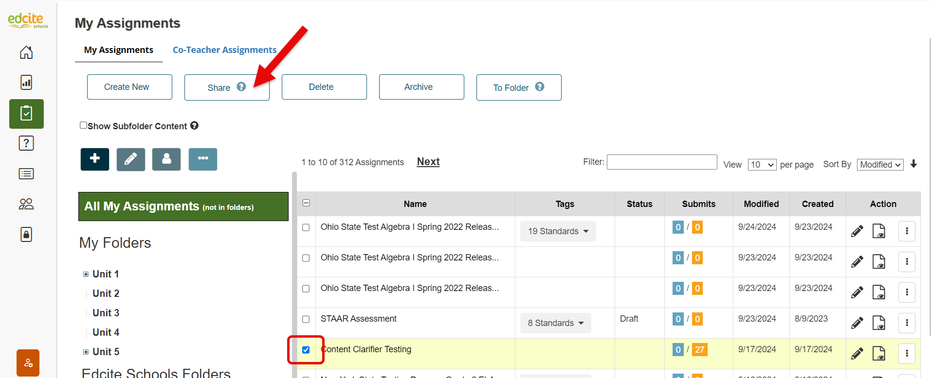 - If you have an Edcite Schools account, you will also have access to Shared Folders (similar to Google Drive or OneDrive) in the section marked Edcite Schools Folders. Teachers can share content into Edcite Schools Folders from their My Assignments or My Questions page. Note: Teachers need to have access to these folders in order to access the content. To obtain folder access, please contact an administrator. For more information, click here.