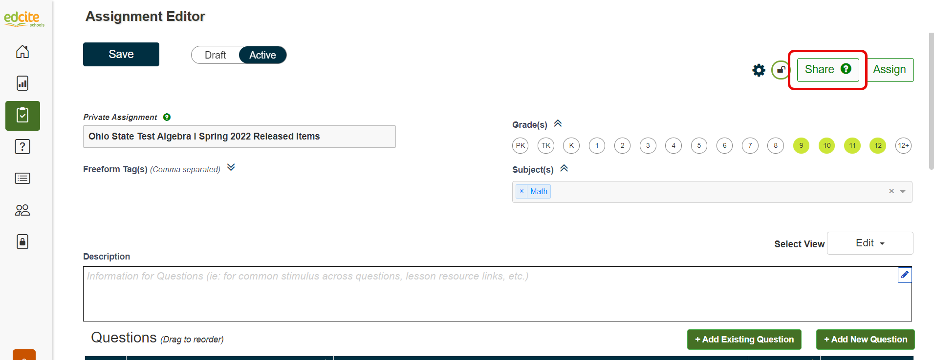 Note: You can also share to public Assignments Library or Question Bank from the assignment or question editor, by selecting Share at the top of the editor page.