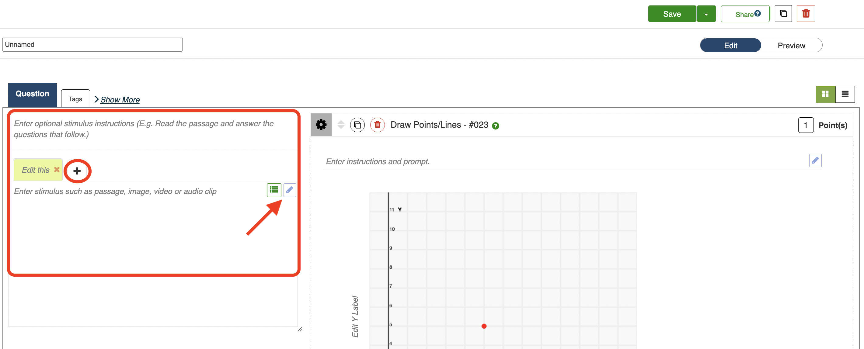 2. If desired, add a stimulus to accompany the question in the space provided by clicking the Blue Pencil button and opening your Rich Text Editor. You can add text, audio, video, or images. Click the OK button upon completion. You can name this tab or you can add a new tab with an alternative stimulus by clicking the (+) button.