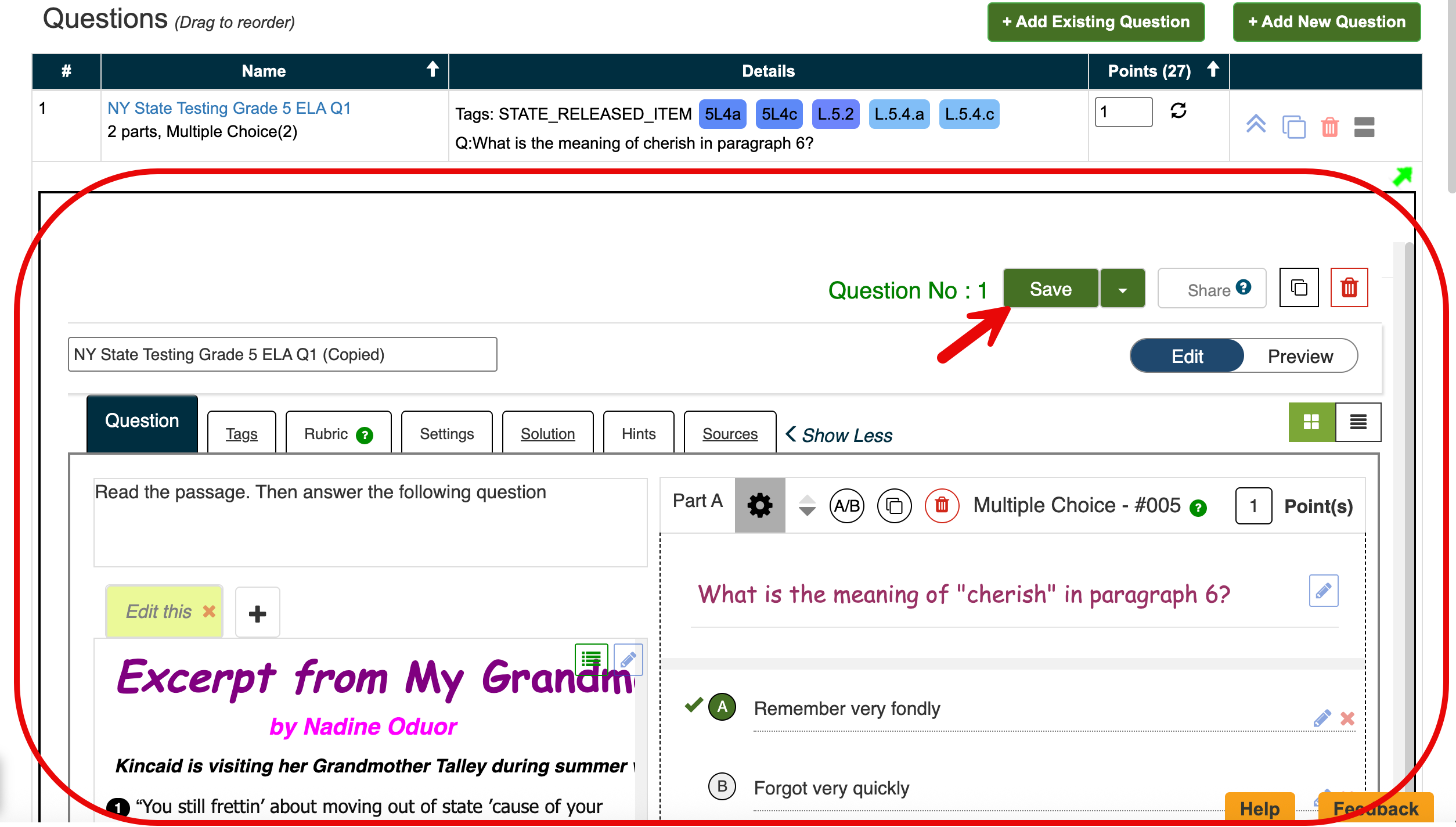 4. The Question Editor will expand below the question details; edit the question and select Save.