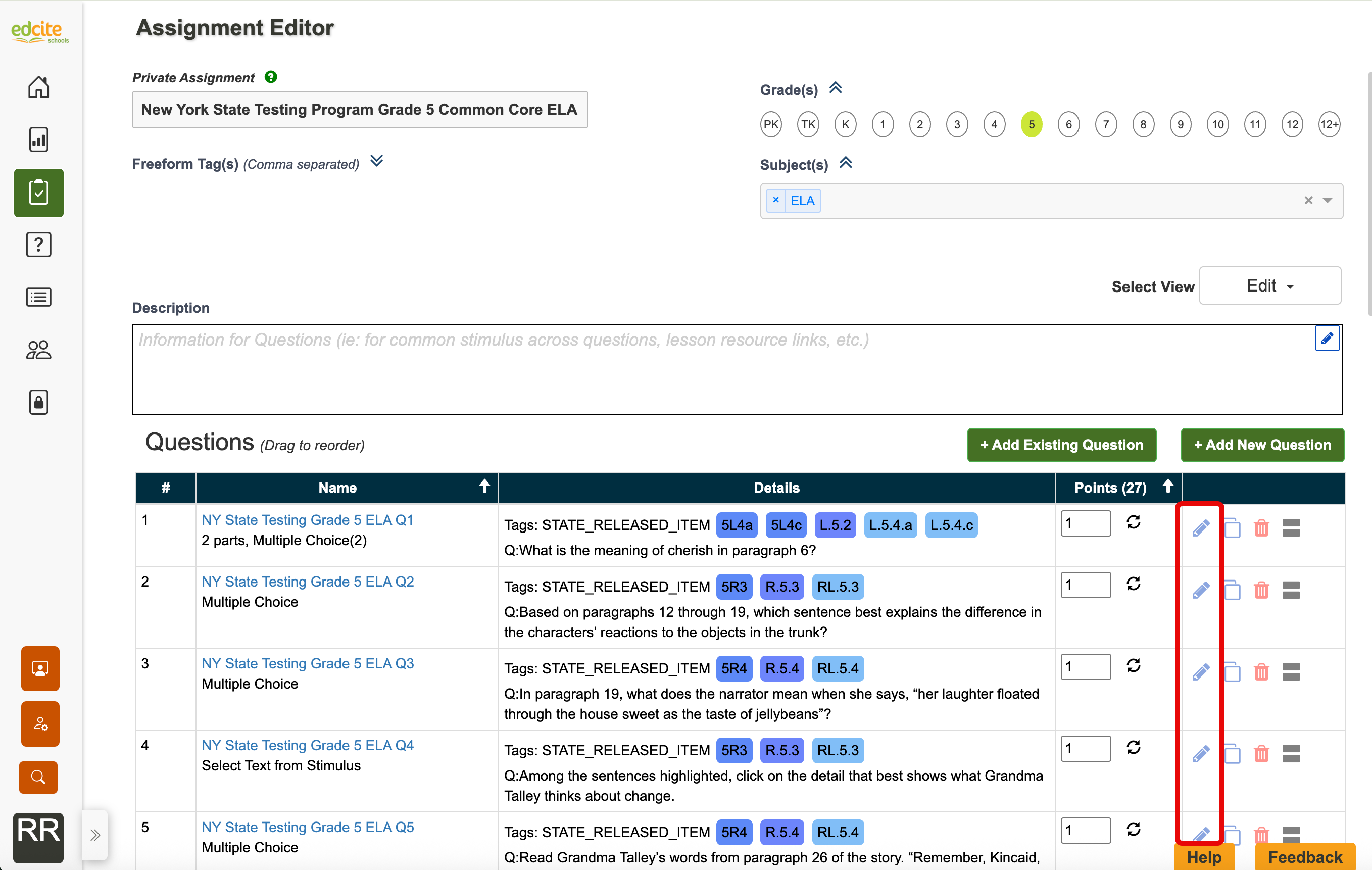1. Open Assignment Editor. Depending on they type of exam you are editing, you can get there three different ways. Assignment from Library- Click Assignments on the navigation bar on the left of your screen, select Library, then click on the three ...