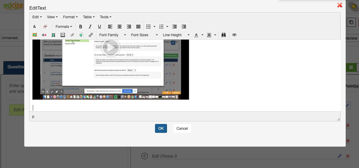 Hit Ok to exit the rich editor. Save the question. In the Question preview, you can see the embedded video and play it.