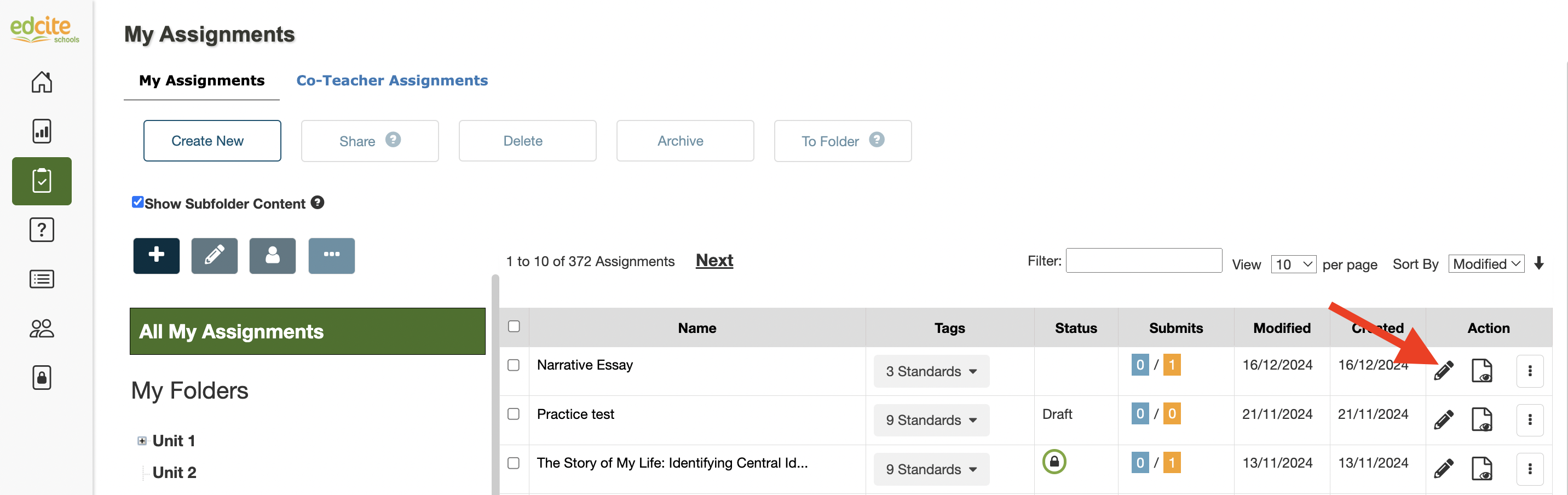1. Open the Assignment Editor by going to Assignments, My Assignments on the navigation bar to the left, then clicking on the pencil to the far right of the assignment name.