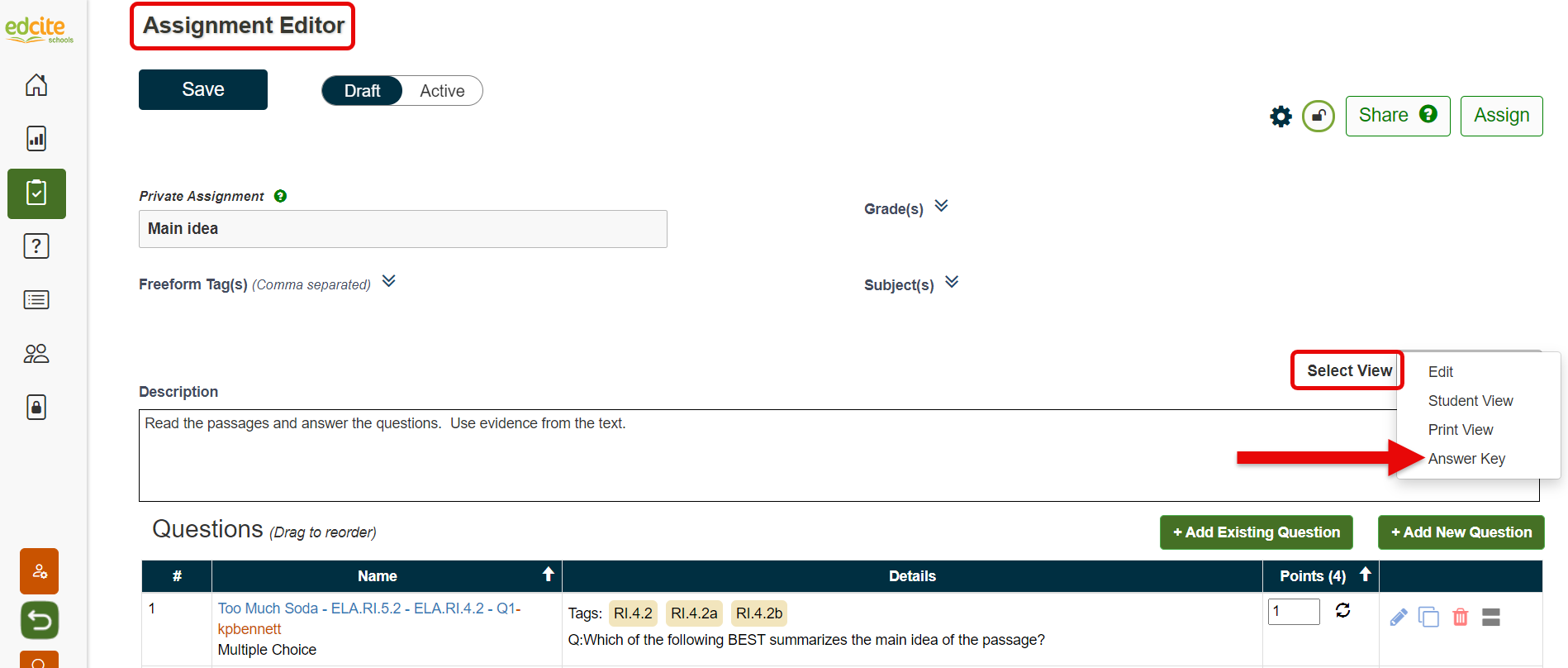 On Edcite, an Assignment is a set of questions you combine and assign to students. Questions are the individual items students will answer. This help document walks through how to create a new assignment using questions that you have either found in ...