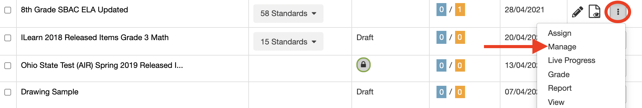 i) Teacher created assignments can be printed from the "My Assignments" page, under the rightmost column "Actions," click the three dots, and select "manage" from the drop-down. Note: "Manage" will not be an option if the assessment has not yet been assigned to students.