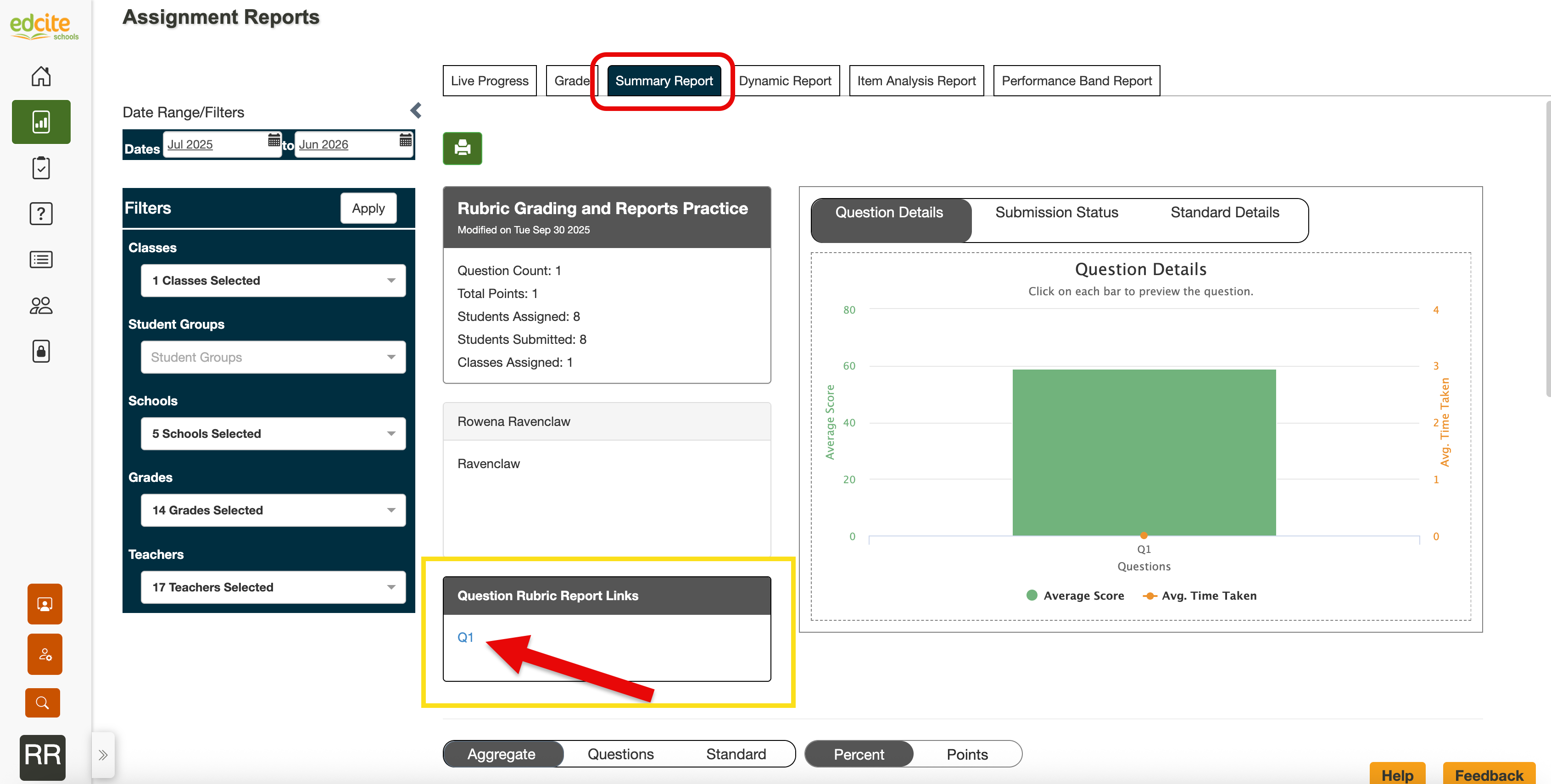 1. Open the Summary Report for the assessment with the rubric(s) you'd like to analyze. In the Question Rubric Report Links box to the bottom left of the graph, select the question you'd like to analyze.