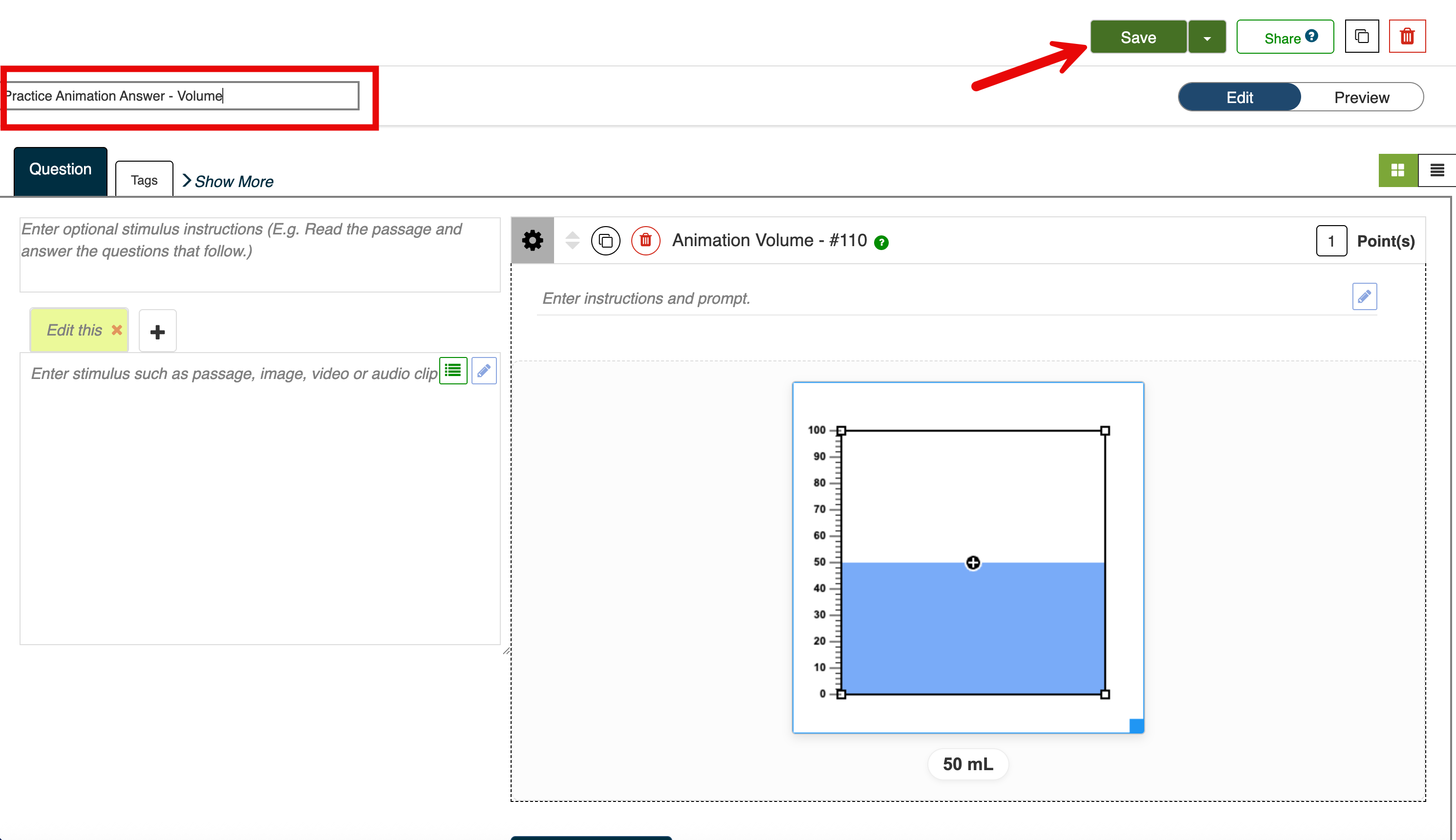 1. Once in the Question Editor, name the question to the top left of the page and select the green Save button at the top right.