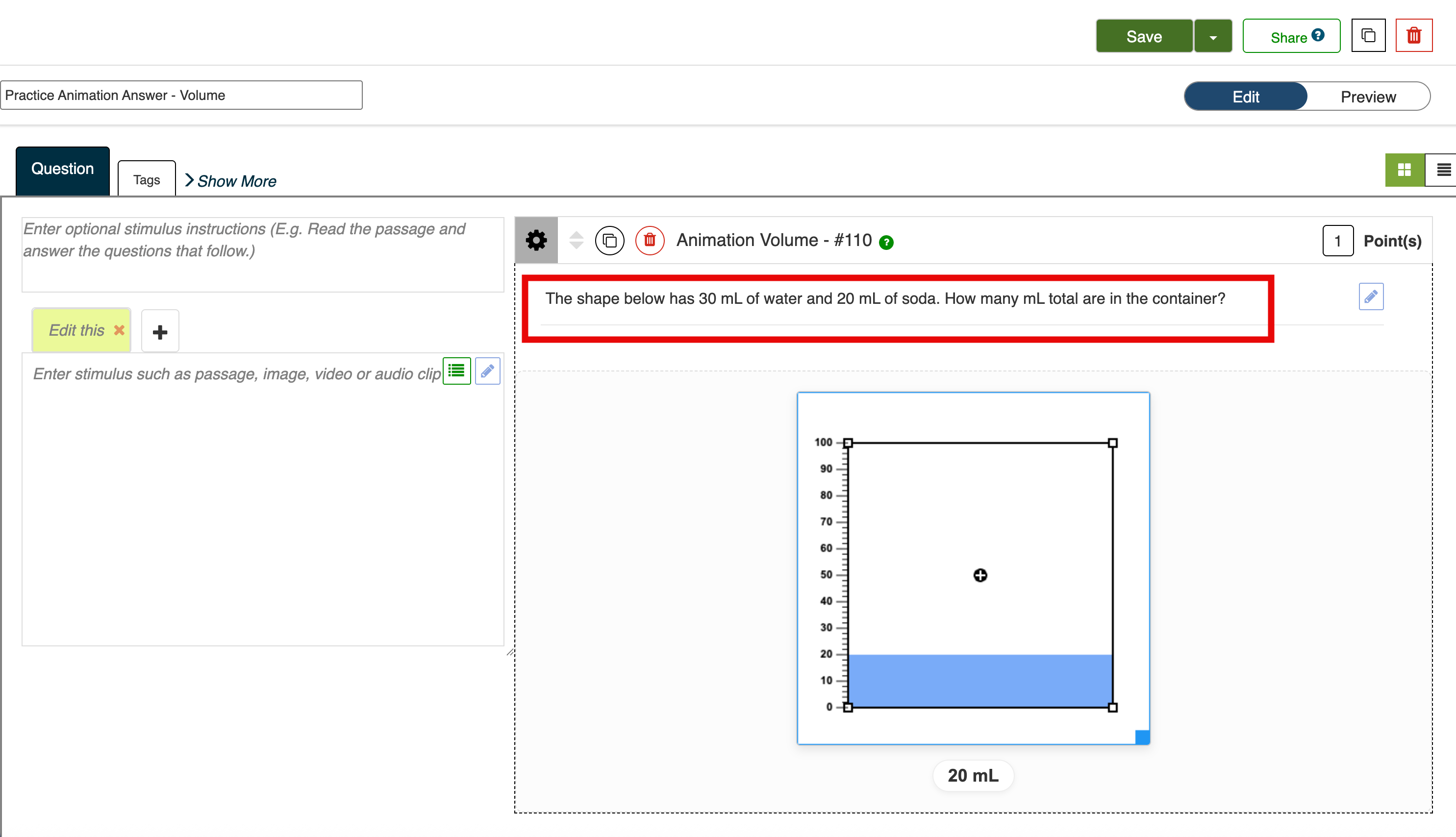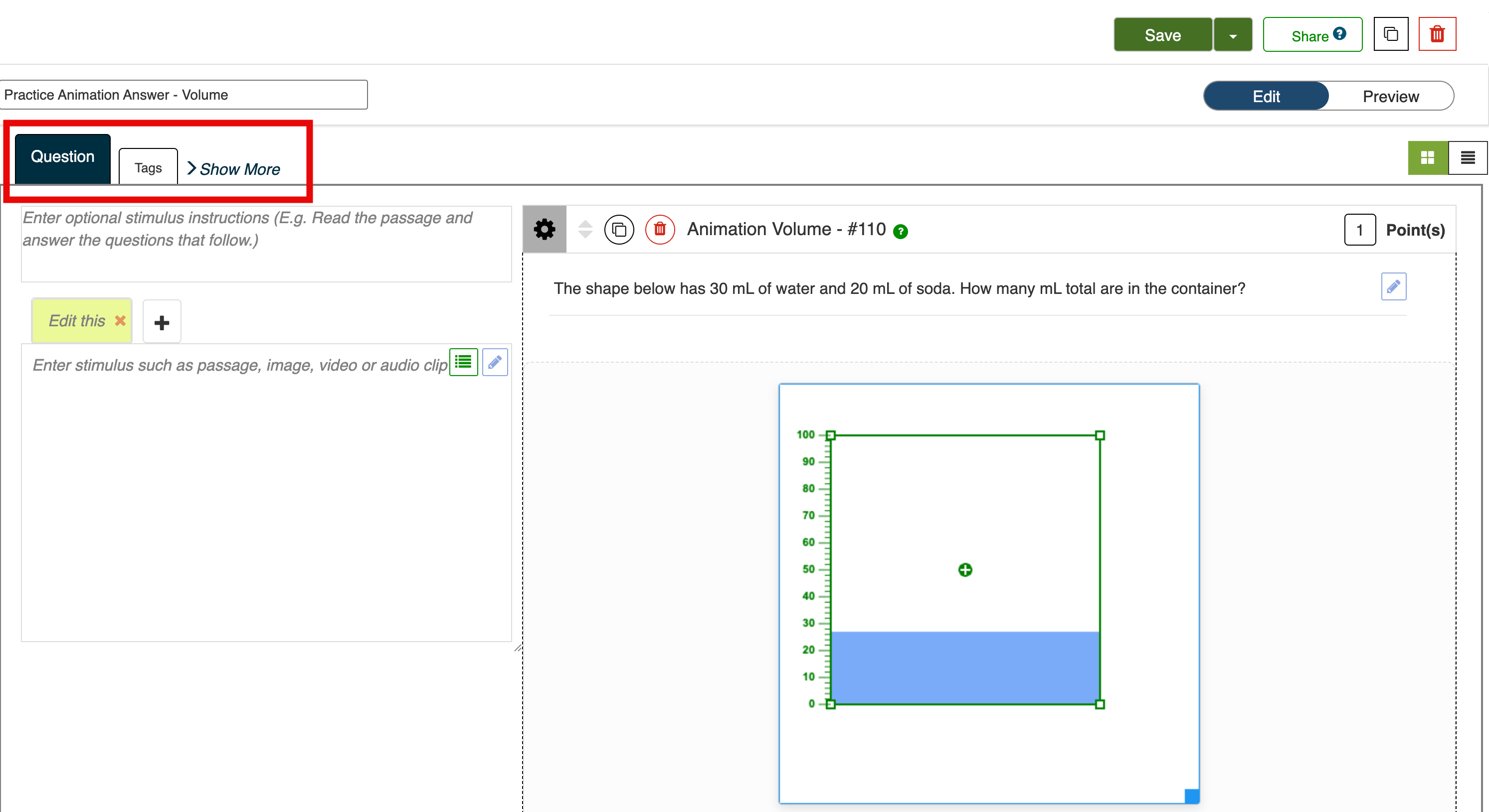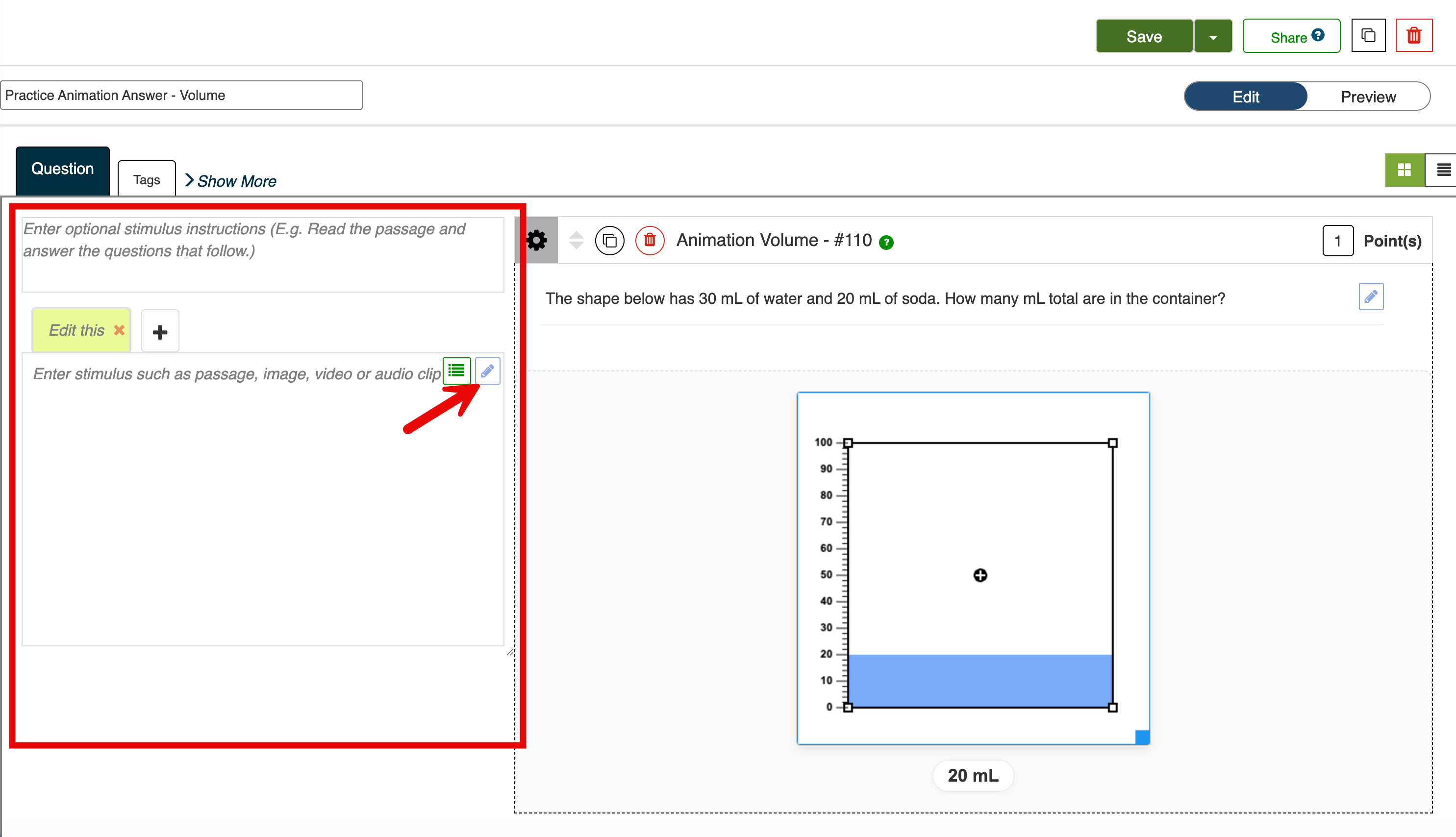 5. Add any additional stimulus/stimuli instructions to the left of the question. Use the blue pencil at the top right of the stimulus box to open the rich text editor, and do things like: add pictures, add videos, format text more precisely, etc.