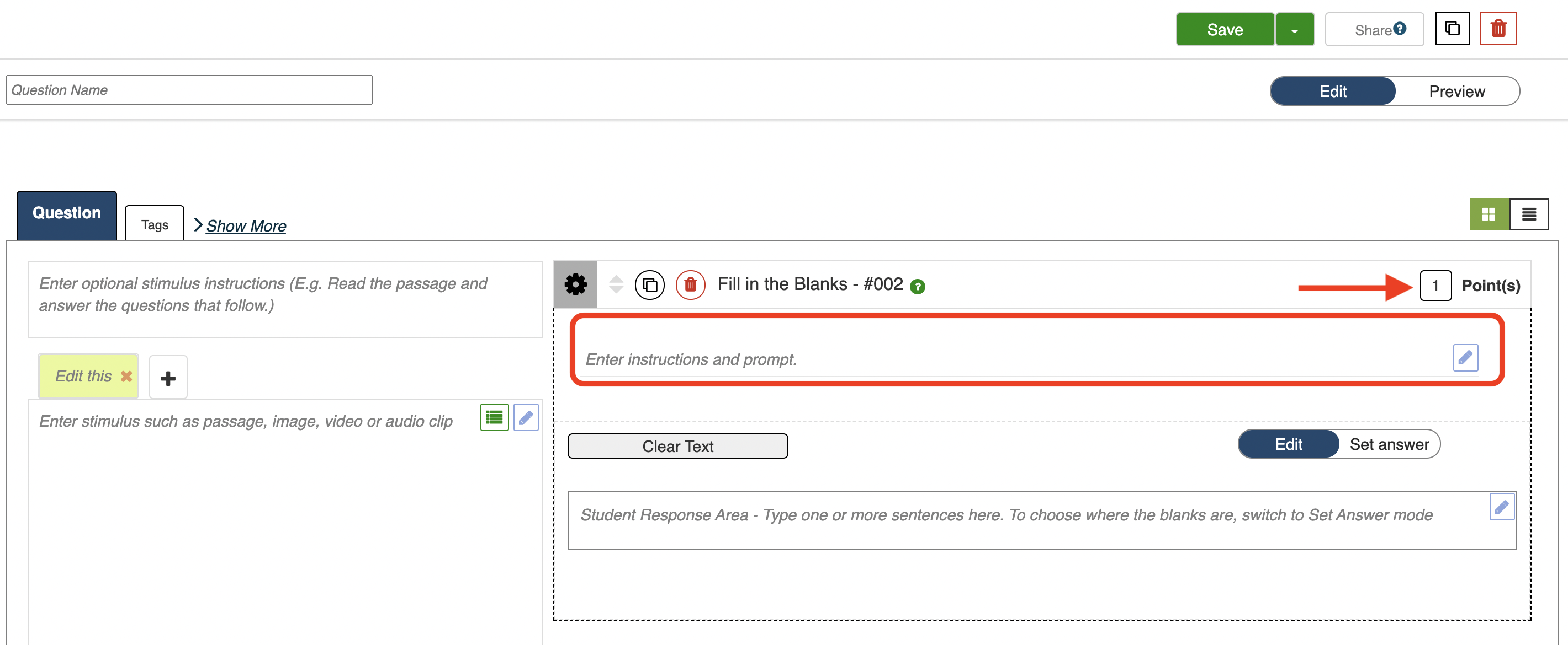 3. Enter the instructions and/or prompts in the space provided. If desired, change the Point value for the question in the box to the left of "Point(s)."