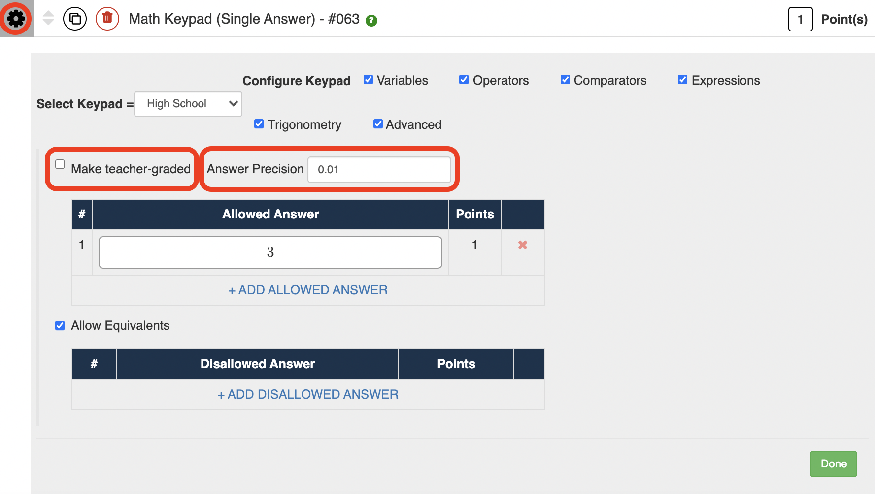 - Scoring: By default, this question type is auto-graded. You can choose to make your question teacher-graded instead. You can also set answer precision, which allows for rounding errors (for example, 2.5 vs 2.51).