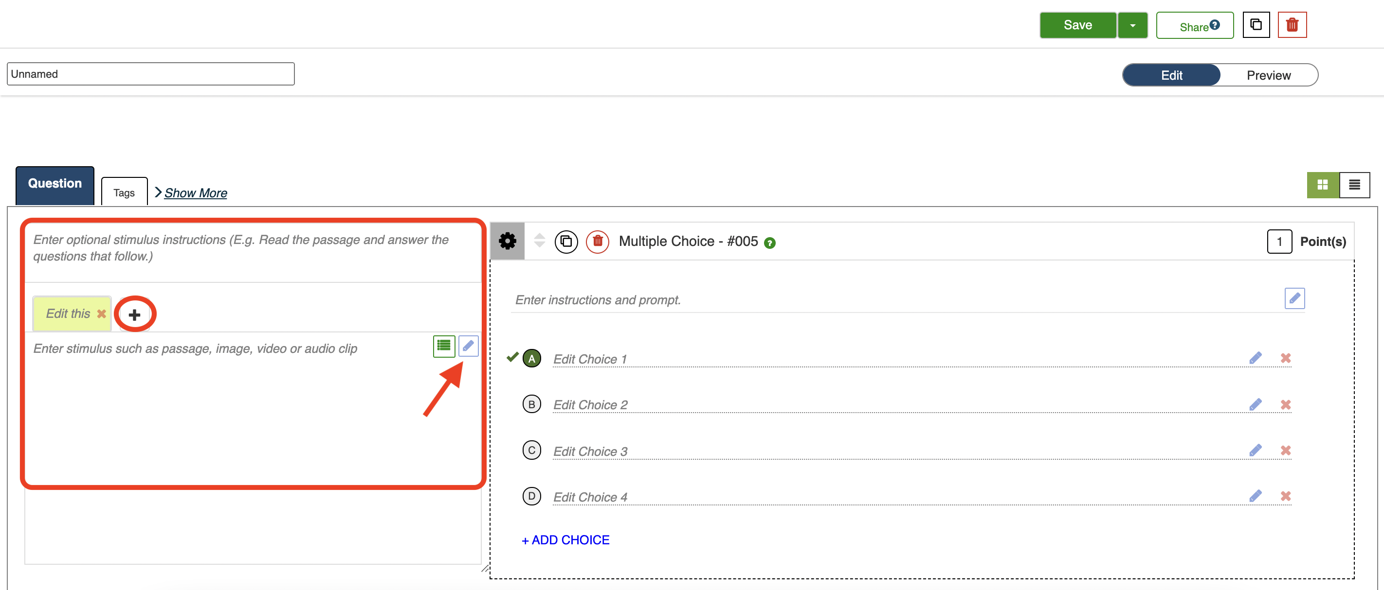 2. If desired, add a stimulus to accompany the question in the space provided by clicking the Blue Pencil button to the right of "Enter stimulus..." and opening your Rich Text Editor. You can add text, audio, video, or images. Click the OK button upon completion. You can name this tab or you can add a new tab with an alternative stimulus by clicking the (+) button to the right of the first tab.