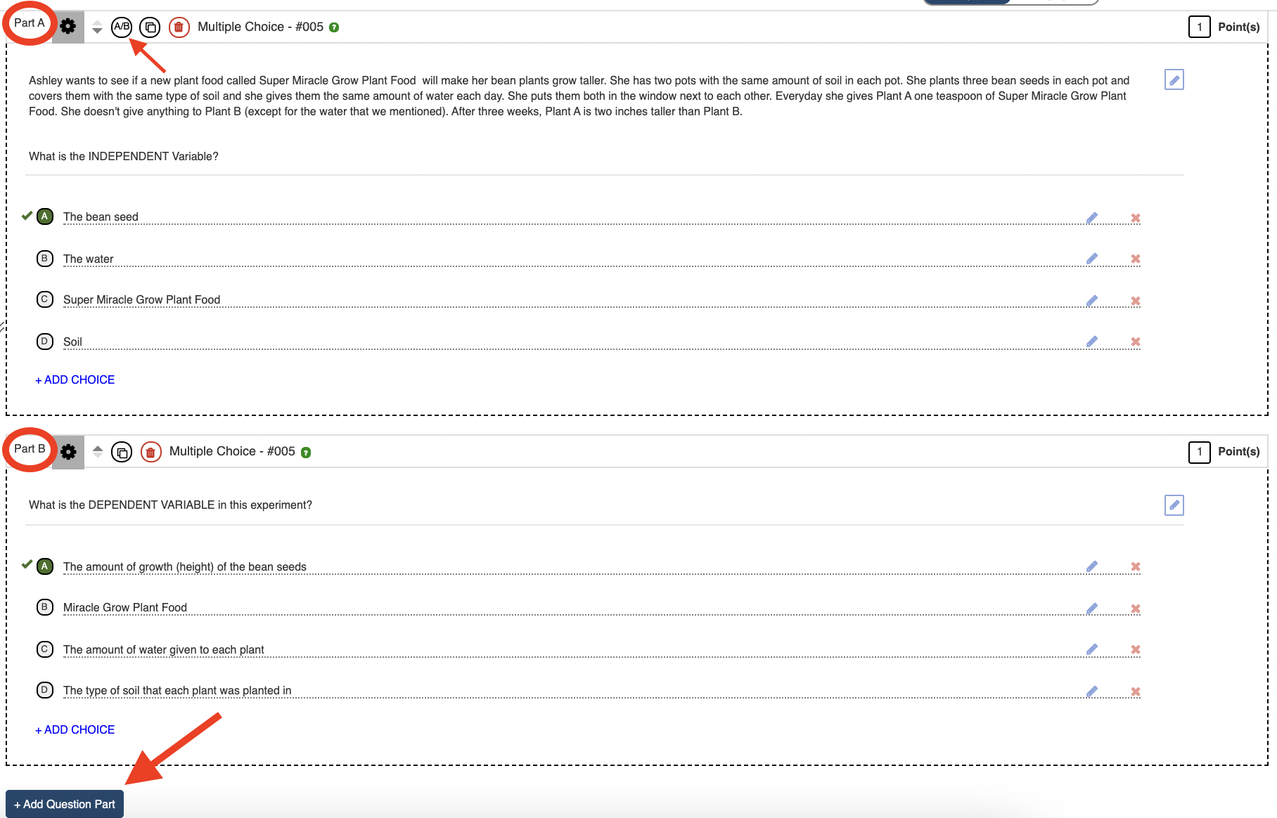 Note: Teachers sometimes like to add more than one part to a Multiple Choice question. To do this, simply click the +Add Question Part button. If you've added two parts to your Multiple Choice question and you don't want students to get a correct answer for Part B if they have answered Part A incorrectly, click the A/B icon next to the Settings Gear in Part A. The icon will highlight in green when it is enabled.