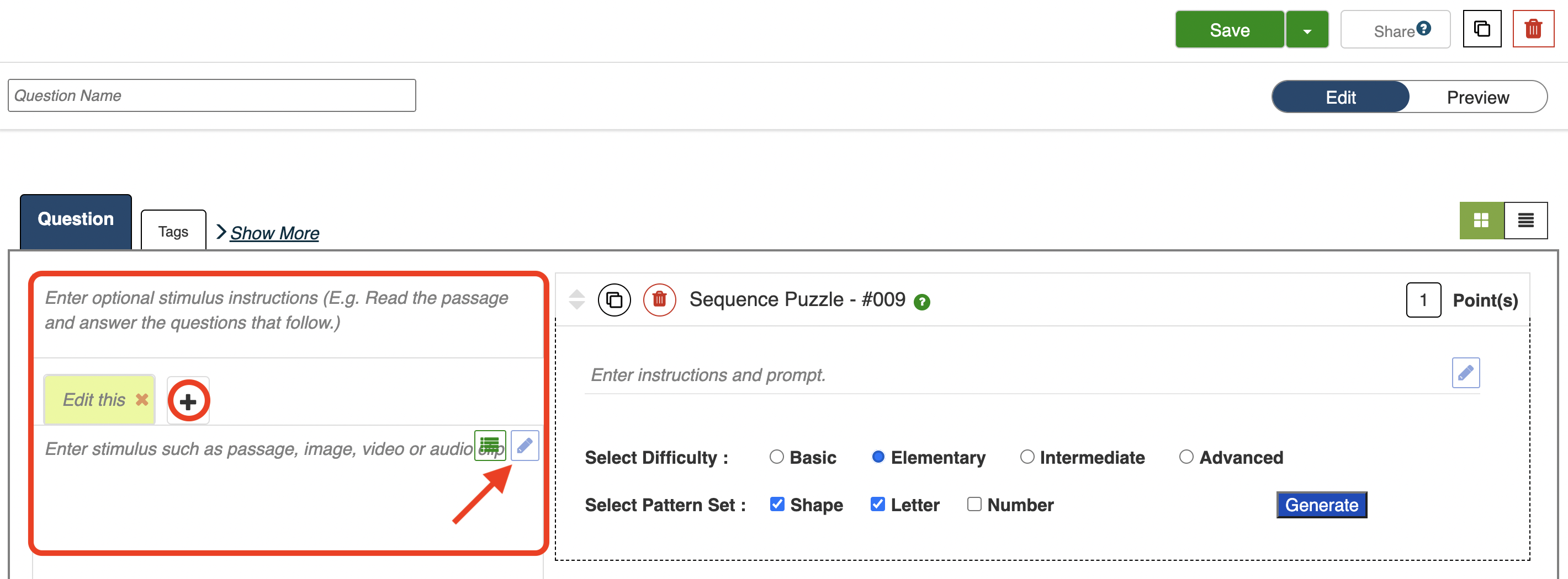 2. If desired, add a stimulus to accompany the question in the space provided by clicking the Blue Pencil button and opening your Rich Text Editor. You can add text, audio, video, or images. Click the OK button upon completion. You can name this tab or you can add a new tab with an alternative stimulus by clicking the (+) button.