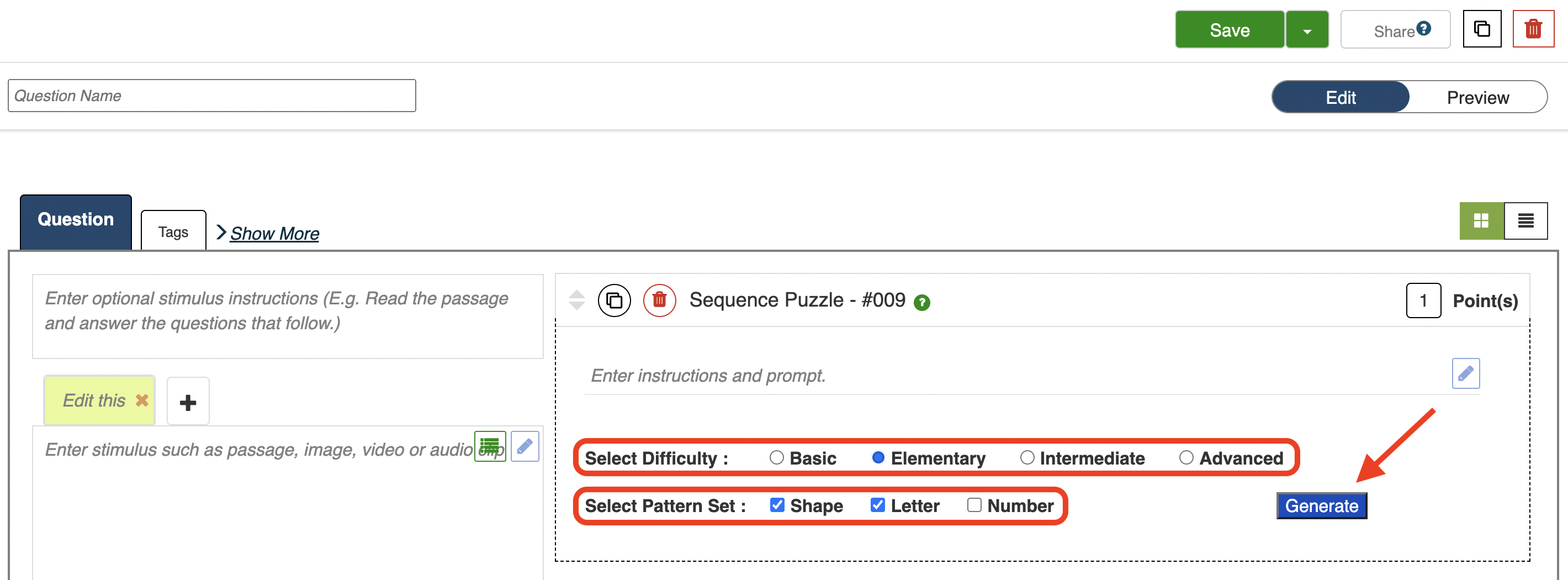 5. Select the difficulty level you want your puzzle to be (basic, elementary, intermediate, or advanced) and the pattern set you want to use (shape, letter, or number). Note: You can use any combination of pattern sets. Click "Generate" when you are ready.