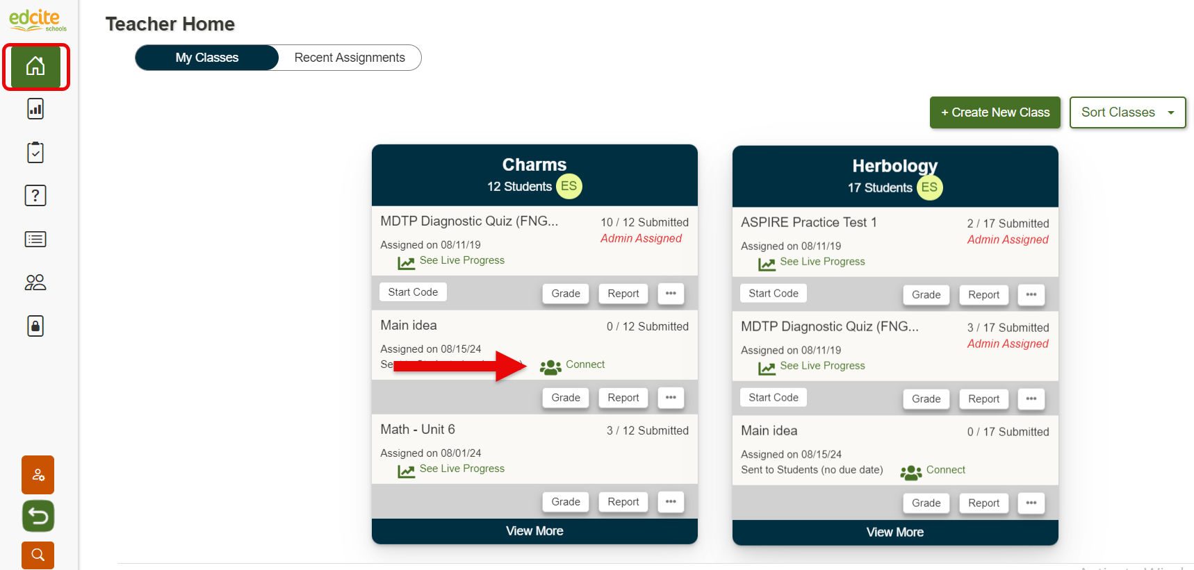 To access Real-time Connect (after you have added it to your assignment), select the "Connect" button on your home page next to the assignment.
