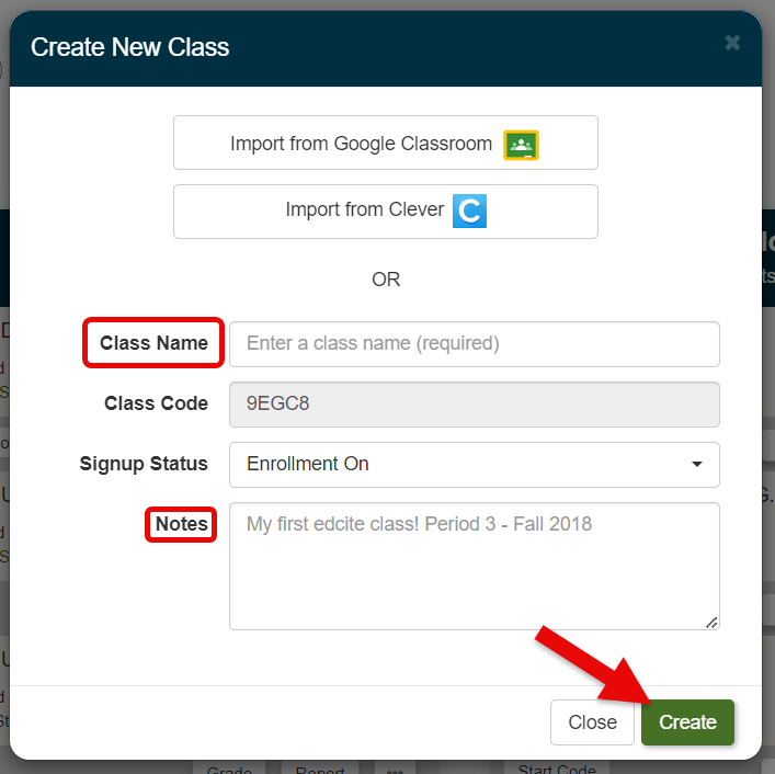 2. Add the class name, any notes, and click the Create button.