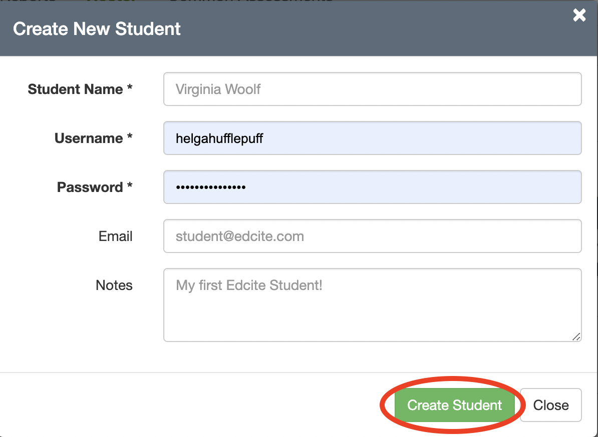 3. Add the student information in the spaces provided and click the Create Student button at the bottom right of the pop up.
