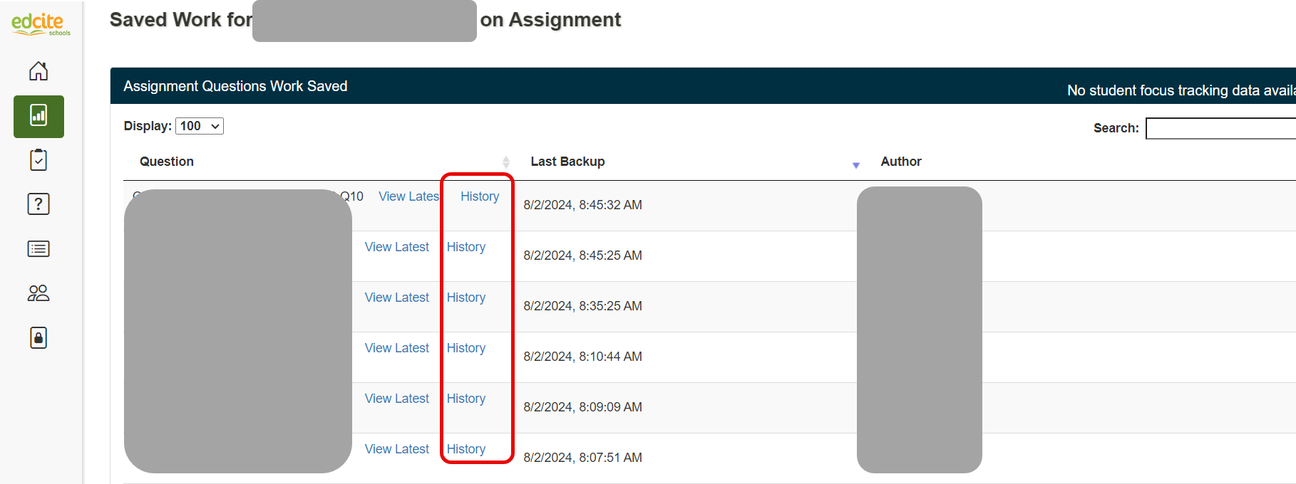 Edcite automatically saves student responses every 30 seconds or so while they are working. If you do not see your student responses on the Grade Page, search the student’s Saved Answer History to retrieve the student’s responses. To do this, follow the steps listed below.
