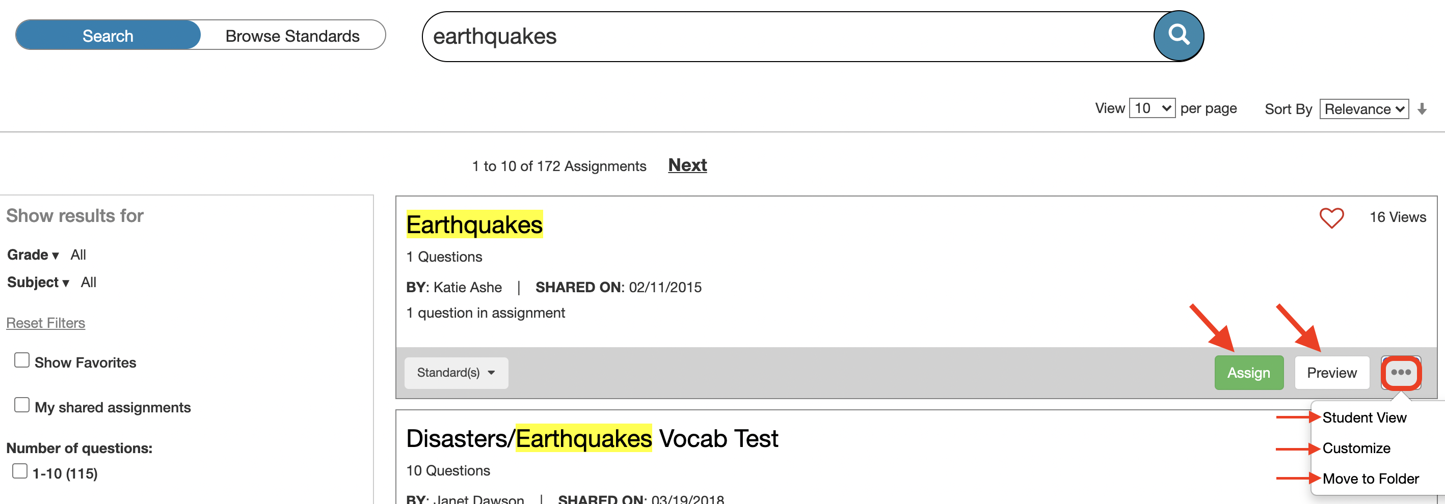 Our Assignment Library is comprised of teacher-created assignments. Please refer to this help guide for how to search the Assignments Library. 1. Once you've found an assignment you wan to use in the assignment library, click on the more button ...