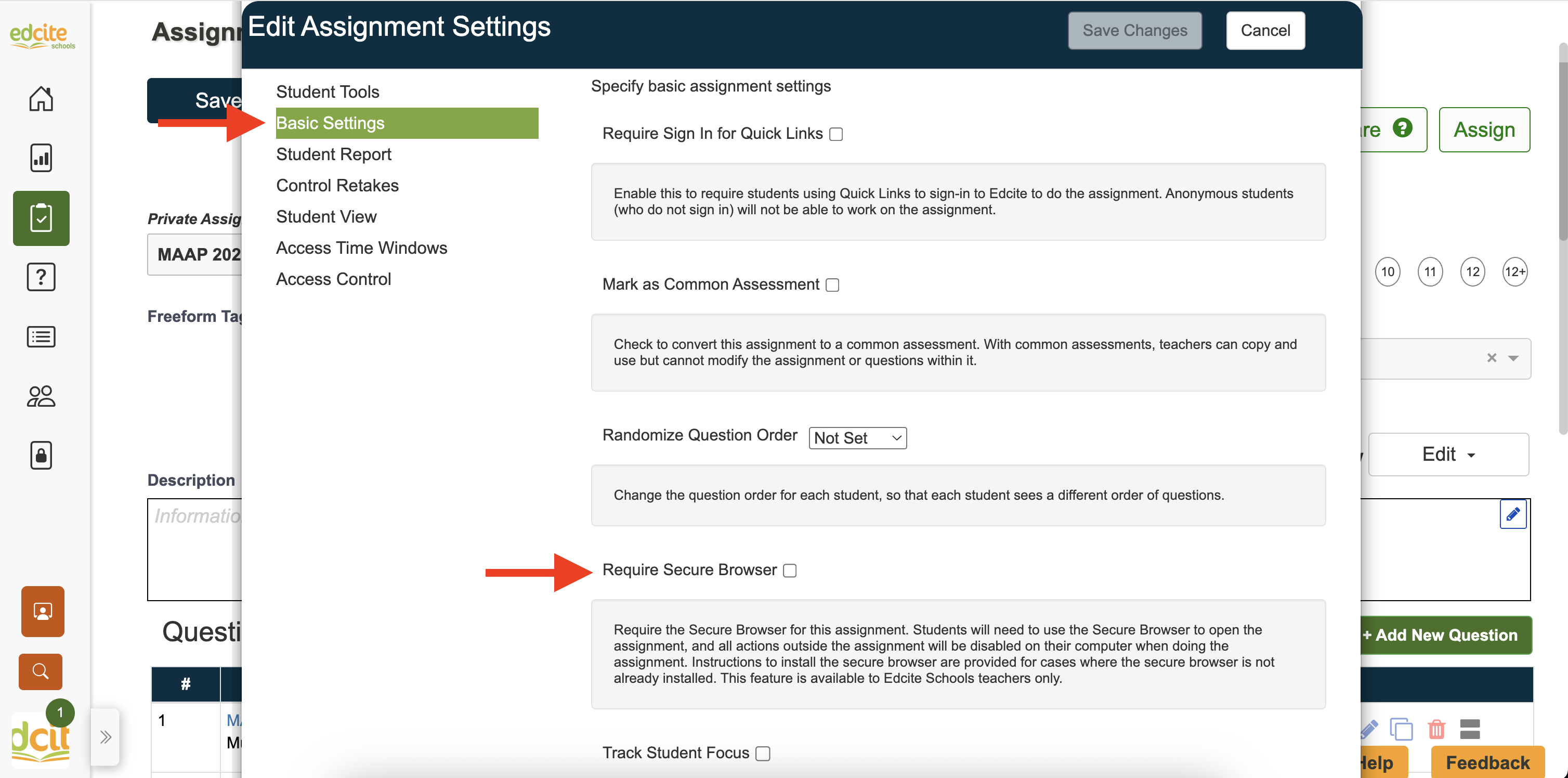 Note: to enable the secure browser on an assignment, go to Assignment Settings, click on Basic Settings, and checkbox Require Secure Browser.