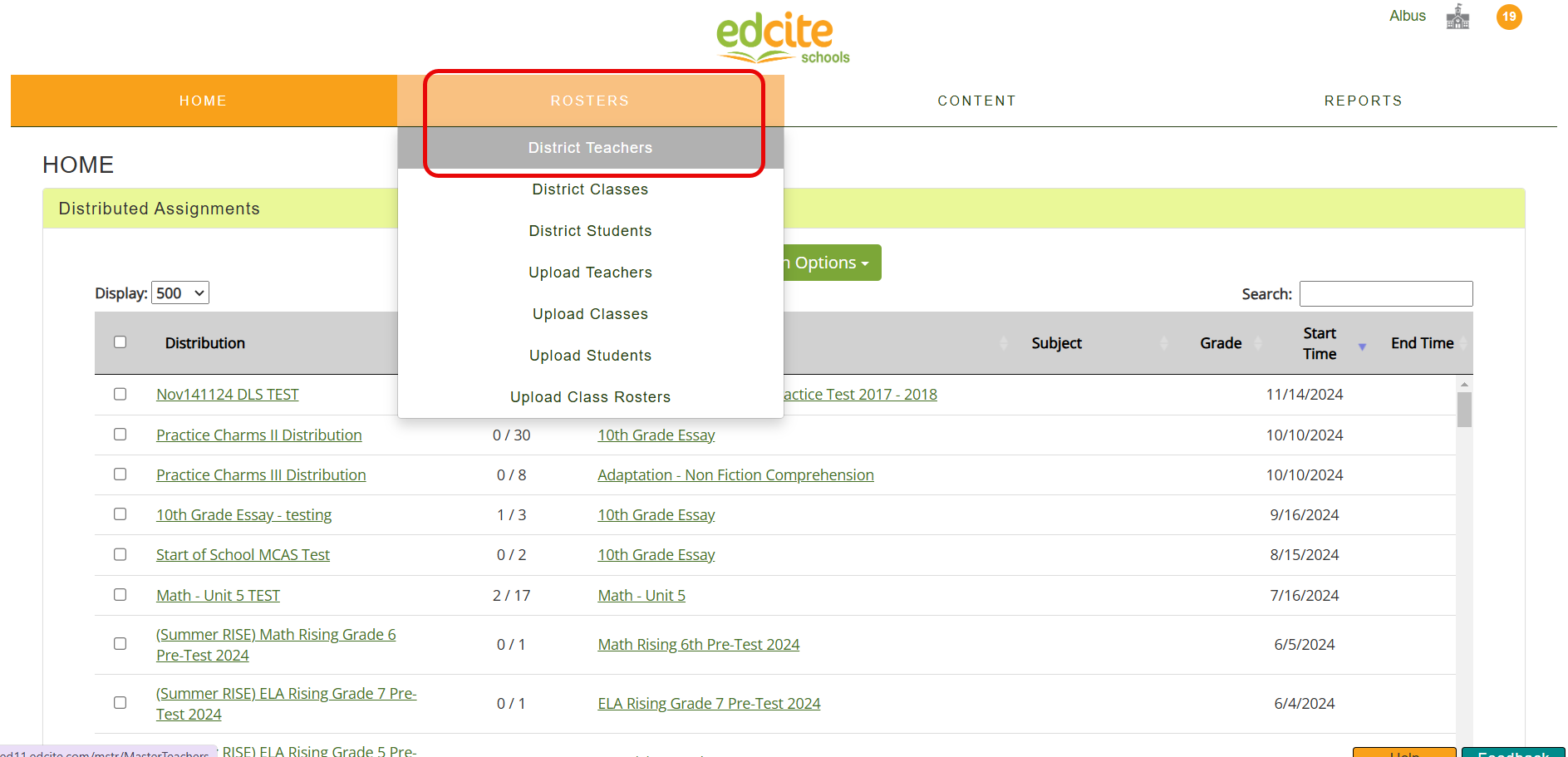 1. Select Rosters, District Teachers from the navigation bar at the top of your administrator homepage.