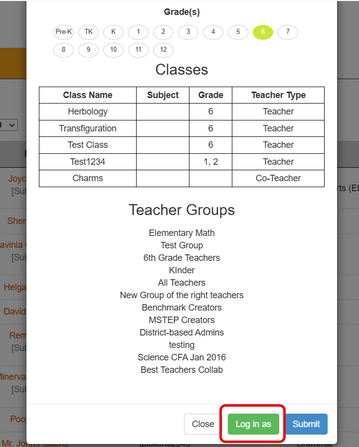 If you are in a teacher group with permissions to sign in as students and/or teachers, you can follow the steps below to "login as" in Edcite.