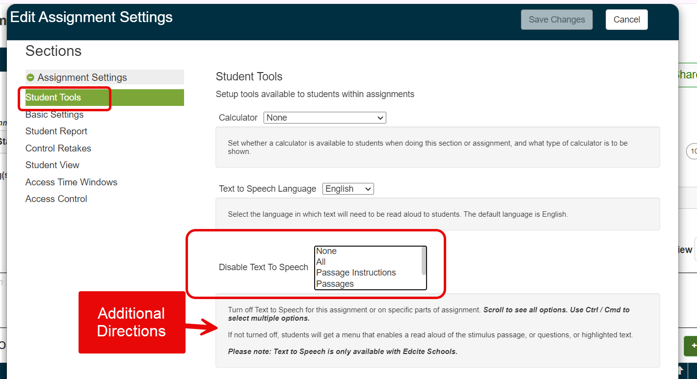 3. Under Assignment Settings to the far left, choose the Student Tools Tab, and then use the direction below Disable Text to Speech to disable the Text to Speech you do not want students to have access to.